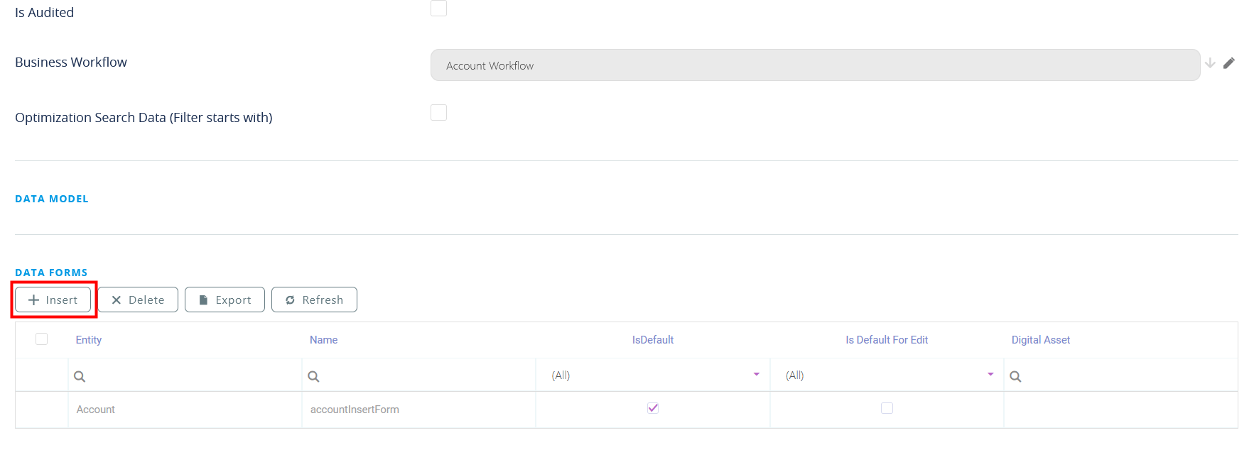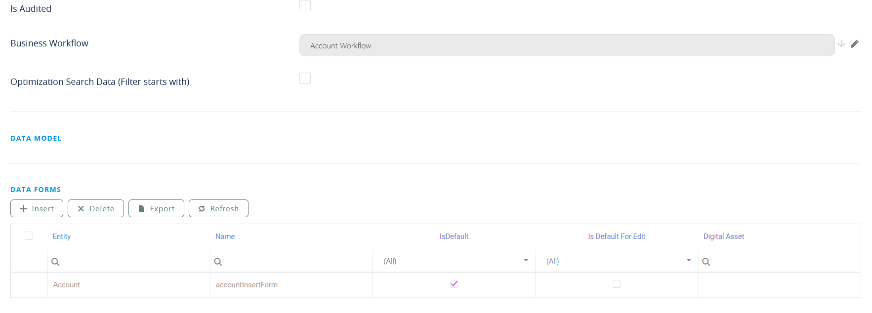 To edit an entity form, expand the Data Forms section of an entity and double click the form. The form's settings are displayed.