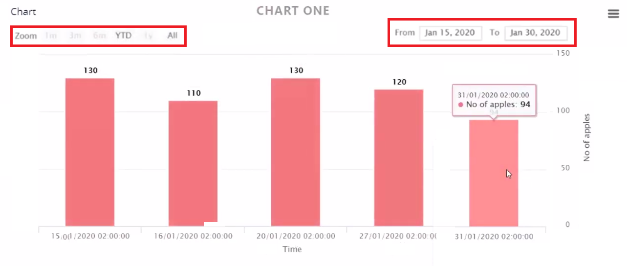 | Render As Time Series | Tick to render chart values over a period of time. It enables you to zoom in/out chart data per time intervals (1 month, 3 months, 6 months, year, or all) and also filter the data within specific from - to dates. The figure below presents a standard bar Finchart rendered as time series: |