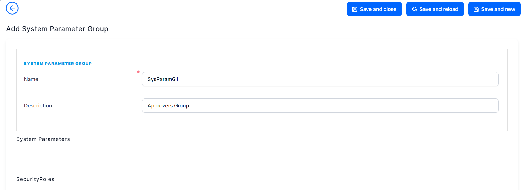 You will now be able to add system parameters and security roles to the system parameter group.