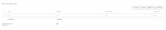 Field Description Label The name of the header item which will be displayed on the form driven flow or app data form. Use Virtual Attribute Select if you wish to display a virtual attribute from the entity's extended data model, instead of a regular attribute. This will replace the Attribute field with a drop-down called Virtual Attribute which will allow you to select virtual attributes instead of regular attributes. Attribute/Virtual Attribute The value of the entity attribute which will be displayed on the header item. If you selected the Use Virtual Attribute checkbox, you will be able to choose virtual attributes from the entity's extended data model. Is Primary Attribute Tick only if the attribute to be displayed in the digital journey or app data form header is also the entity's primary attribute. - Click Save and close. The page refreshes and the header item is displayed in the Entity Form Header Items list.